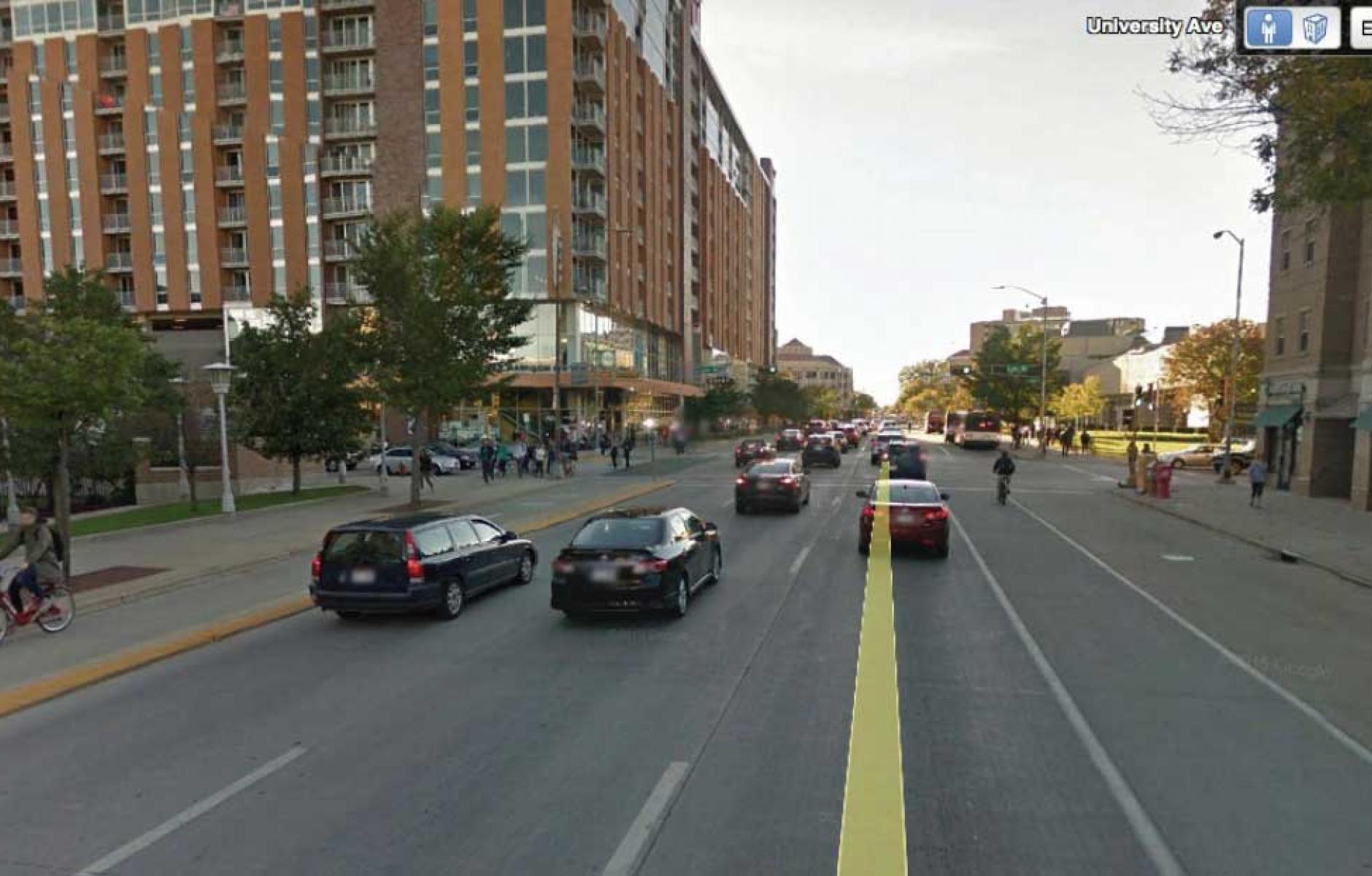 At the top of this article see a Google image of Campus Drive in Madison, Wisconsin, provided by Chris McCahill of the State Smart Transportation Initiative. In the photo observe somebody on bicycle, lots of people on foot (more than the number of cars), multifamily residences, businesses, and other buildings with commercial, residential, workplace, and institutional uses. The street is a vital corridor for students, staff, and others associated with the University of Wisconsin. It borders the campus, forming a seam between the city and the university. It is also an NHS road. See a map of the thoroughfare below. Drivers are impacted by congestion about two hours a day for about a half mile, and lesser congestion beyond that.