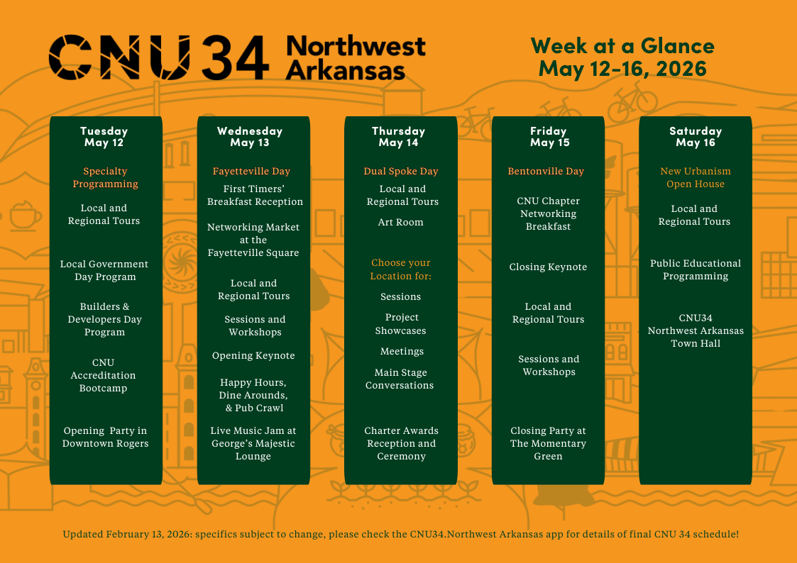 As a truly multi-city Congress, CNU 34 is giving our out-of-town attendees the opportunity to build an experience based on the type of place they want to stay - while still providing the transportation needed to get to sessions and events (and parties!) across the region. You can view the Visual Schedule here, which demonstrates how the week will work.