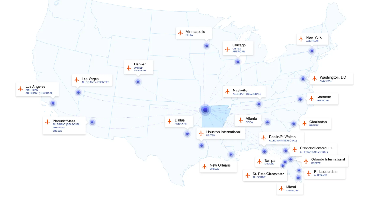 Northwest Arkansas's airport, XNA, offers nonstop flights to more than 20 cities across the country - from the East Coast to the West Coast and several cities in between: