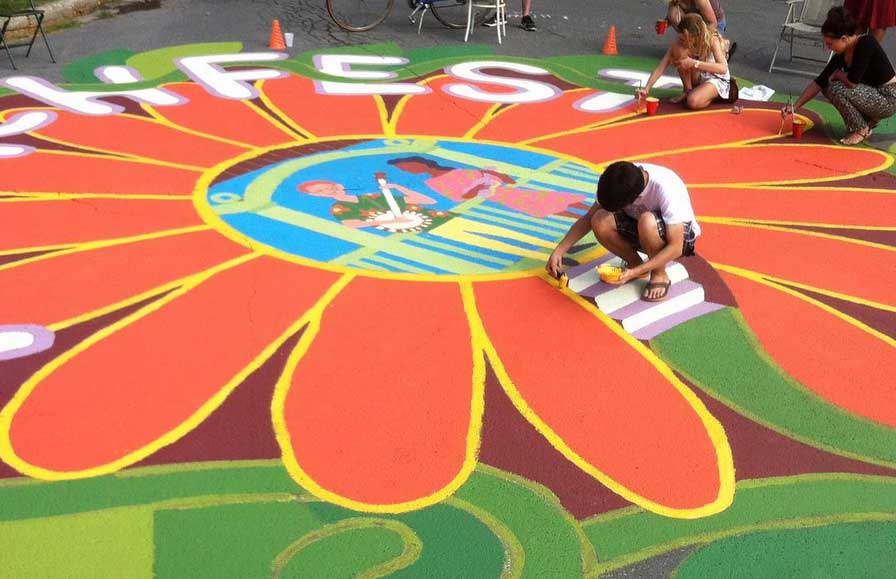 As a special celebration of the 10th Porchfest, volunteers painted an intersection near where the founders got the idea. The flower design features musicians at the center and proclaims "Porchfest." Like the signs, this artwork leaves a trace on the neighborhood.