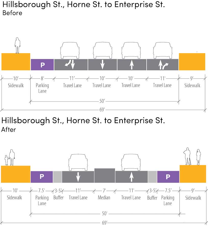 “The improvements along Hillsborough Street have changed interactions between motorists and pedestrians, slowing down motorists and encouraging higher frequencies of pedestrian traffic,” explains NCDOT.