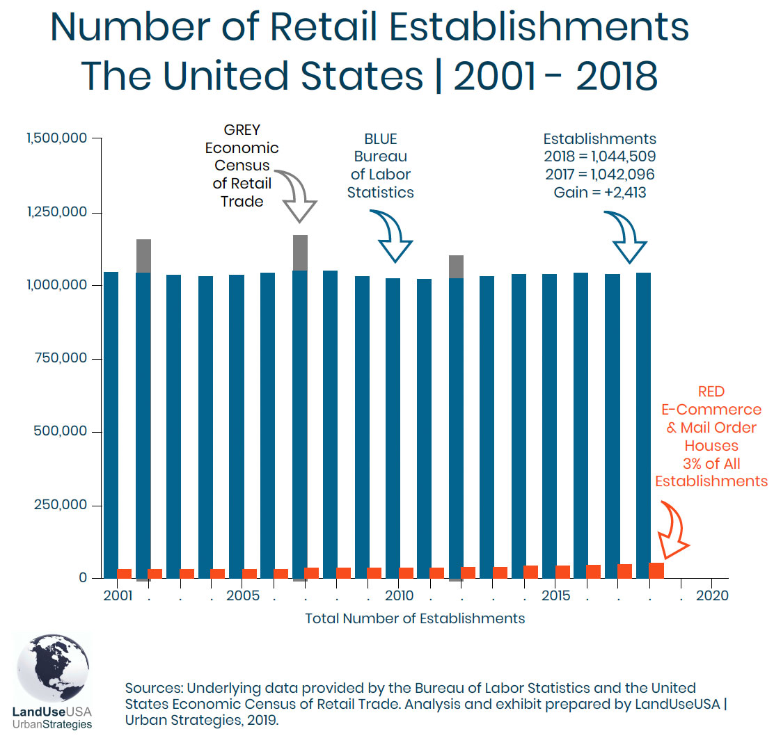 A timeline of total retail establishments since 2001 is shown in Figure 1, with data reported by the Bureau of Labor Statistics. This same chart also shows a timeline of e-commerce establishments and including mail order houses (i.e., non-stores). They currently total 33,000 (3 percent) of all retail establishments.