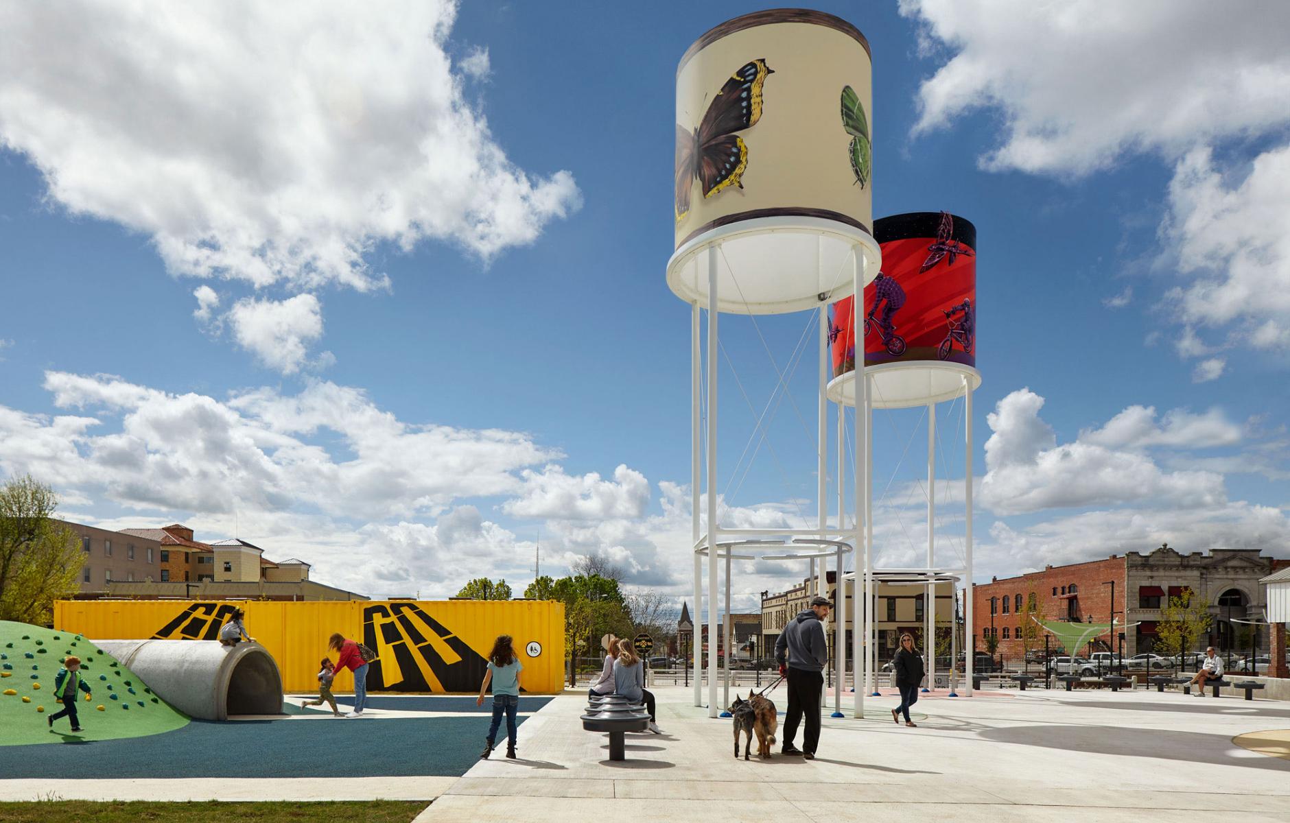 The park is the site of monumental sculptures, the Water Towers, that reference the site’s industrial and railroad history. The park is also part of the city’s civic center, where the fire department headquarters, utility services, city hall, and nonprofits are located—and the towers fit into that utilitarian context. The three Water Towers are canvasses for local and international artists.