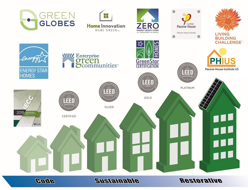 If LEED is the present, then Passive House is the future. LEED is a great place to start, but it is merely one of many thoughtfully-designed building rating systems. Some individuals – architects, builders, and clients alike – are advocating for a shift towards more advanced energy efficiency rating systems. These standards and certifications range from bare-minimum code all the way to restorative standards. In the diagram below, the rigor of each building standard increases from left to right.