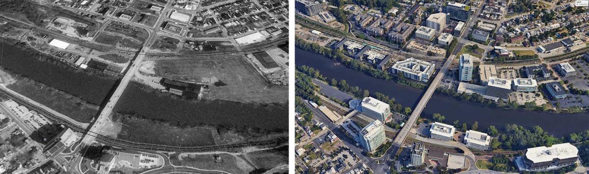 Barnett provides two examples of this type. The first, Conshohocken, was a “sleepy borough in Montgomery County” that lost its industrial base. Industrial lands on the river have been transformed over the last three decades into a walkable, transit-served “regional office center with high-density residential development.” The nearby blocks of a local main street have become “a thriving restaurant destination.” The amount of development that has taken place is astonishing. The area needs no BID, Barnett reports, because the borough is so small that local government can pay close attention to the needs of the businesses.