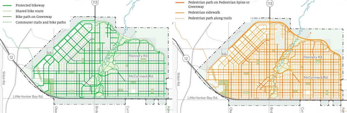 Bicycle network, left, and pedestrian network, right. Source: California Forever