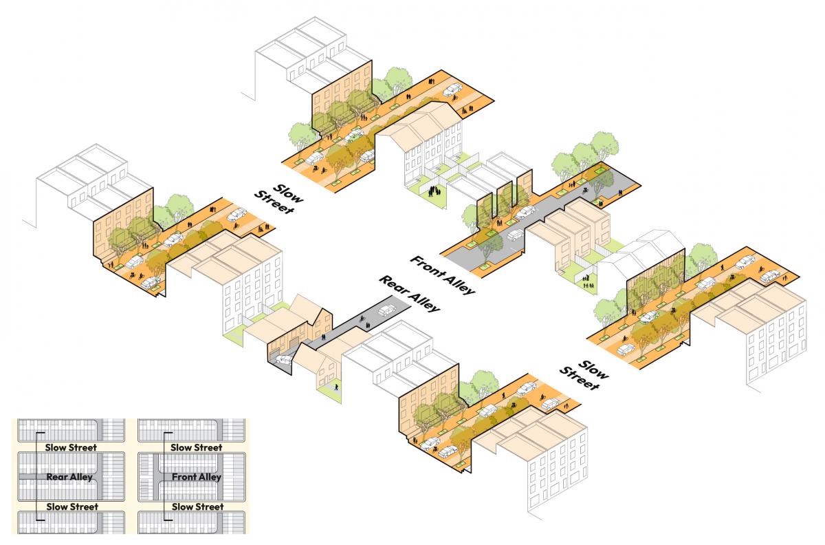 The relationship between slow neighborhood streets, real alleys and front alleys. Source: California Forever
