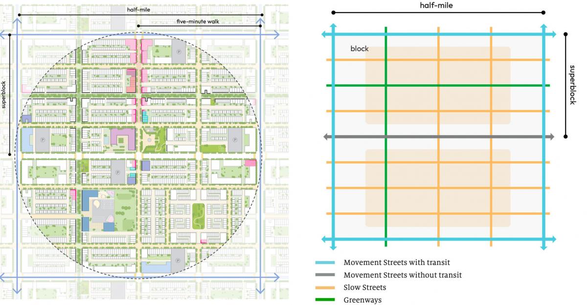 Planning for a typical neighborhood, left, and the neighborhood street and block structure, right. Source: California Forever