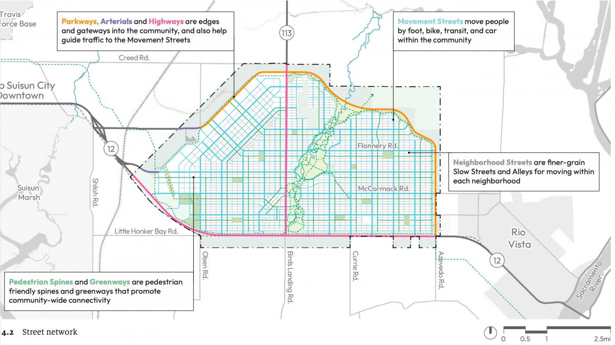 CNU cofounder Andres Duany, who was interviewed for this article, calls the California Forever plan “terrific” and “very advanced. … The grid is very sophisticated,” Duany described the plan as a “tartan grid,” with A, B, and C types woven together. These include higher-traffic “movement streets,” slow neighborhood streets with light traffic, and greenways that don't allow cars—but are fronted by buildings—creating long bicycle corridors throughout the city.