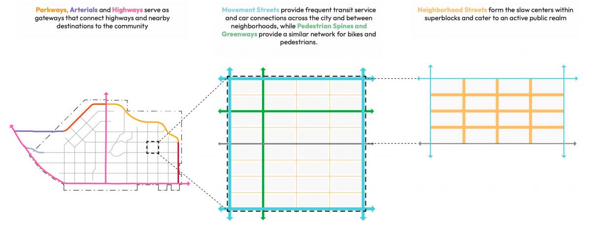 The movement streets will be designed as boulevards, with four rows of trees and dedicated Bus Rapid Transit (BRT) lanes in the middle. None of these types, including movement streets, will have more than one lane of automobile traffic in each direction—making them crossable for pedestrians and bicyclists.