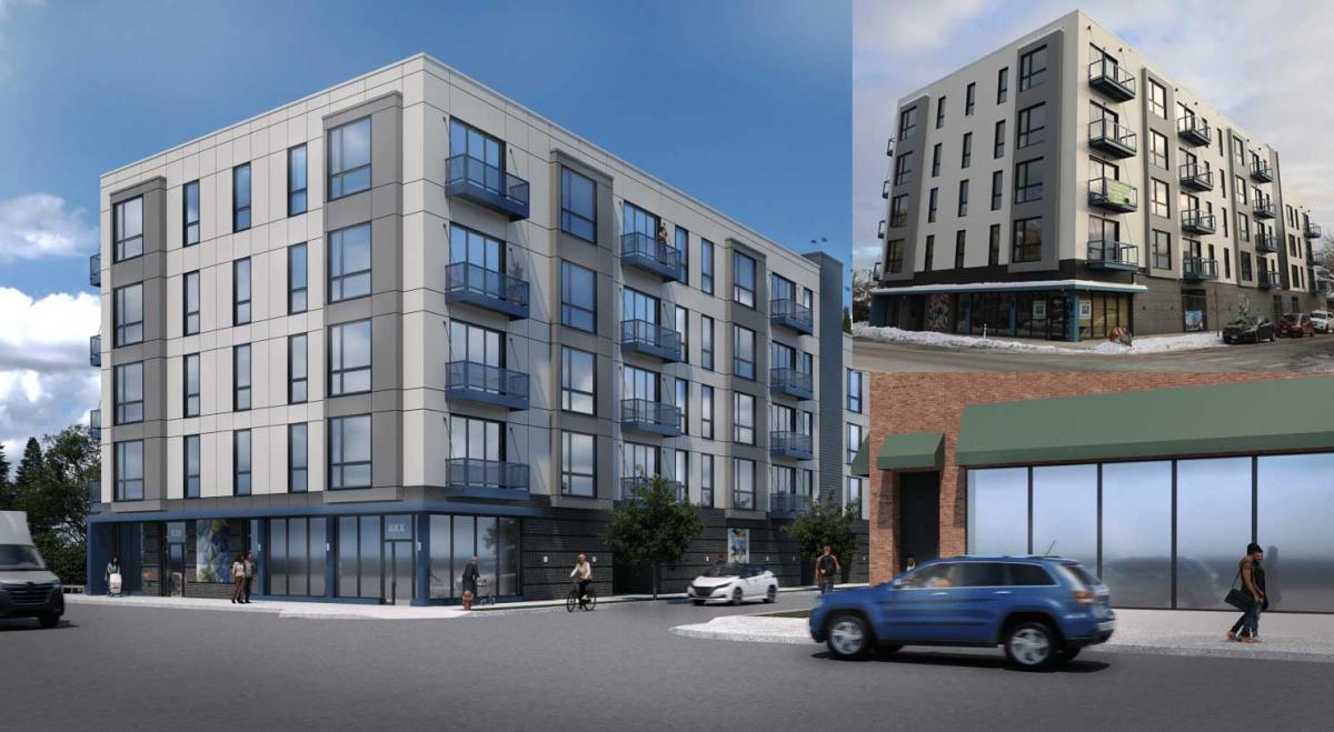 Oak Park Commons rendering, with inset photo of the recently completed building. Source: Oak Park Commons Cohousing.