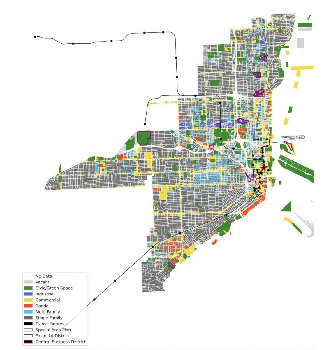 In fact, Miami is nearly 100 percent built on a grid, with relatively small blocks, creating good bones for urbanism. Miami 21 is creating more useful destinations to walk to, in addition to the frontages that make walking more interesting—while allowing for development of compact housing types. Google Street View reveals that the City still needs to make walking more comfortable—particularly by planting shade trees that give pedestrians respite from the subtropical sun.