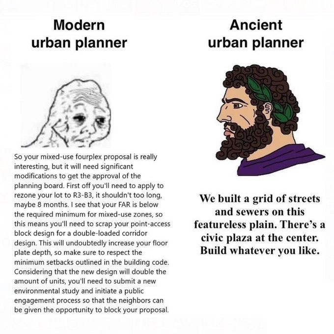 The meme, posted by Southern Urbanism writer Aaron Lubeck, compares a conventional, modern urban planner to an ancient planner. The modern planner presents a familiar litany of obstacles to the builder trying to create housing in an urban place (“you are going to need a rezoning … the FAR is below the required minimum for mixed-use zones … you will need to scrap your point access block design for a double-loaded corridor design,” etc.). The demands sound depressing and discouraging, if not a bit ridiculous—but they are grounded in today's entitlement environment.