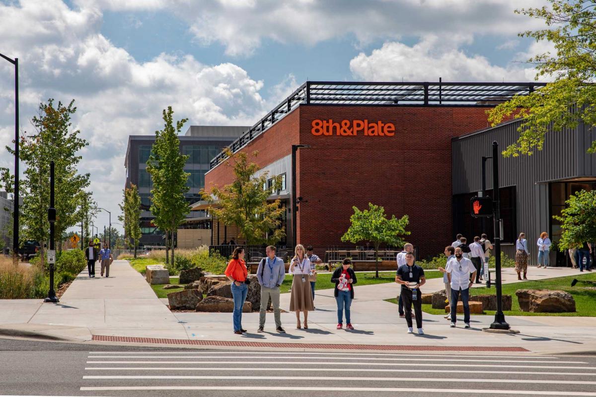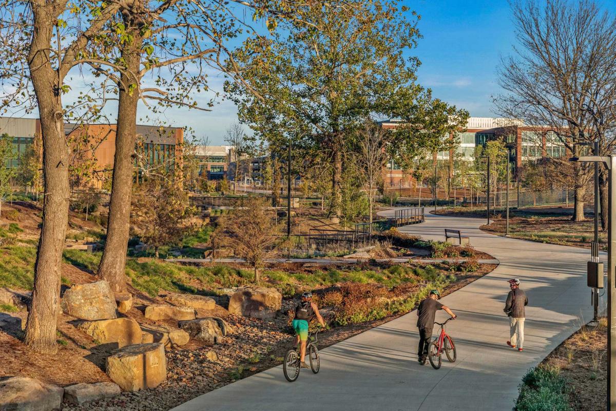 The District is designed with overlapping five-minute walksheds—one centered on mixed-use Eighth Street with the food hall and auditorium, another on the Walton Family Whole Health and Fitness facility, and another on the parklands.