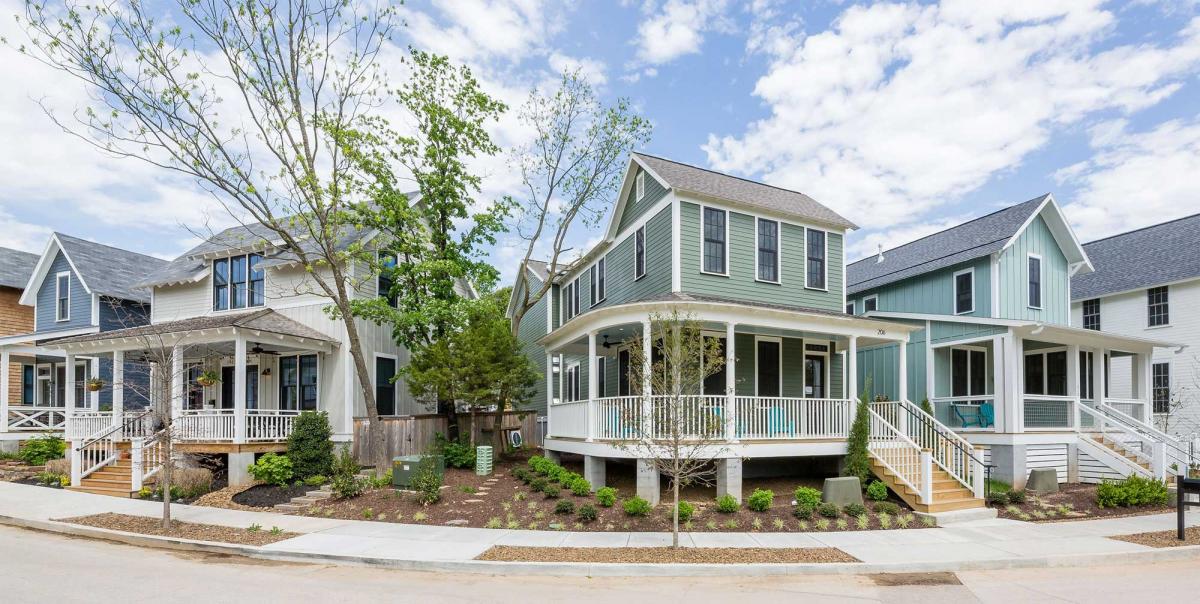 The neighborhood’s custom street section promotes walkability, social connections between pedestrians on sidewalks and residents on front porches, and slower traffic speeds. Street tree plantings were informed by data from the Bartlett Tree Laboratory Field Testing for urban tree soil options, resulting in a buildable, low-tech solution that integrates tree-well root paths into adjacent residential landscapes. The meticulous approach provides adequate topsoil space for Overcup Oaks, native to the southeast, yielding nearly double the foliage volume of street-tree plantings elsewhere in the neighborhood, the design team explains. “This low-tech, cost-conscious solution illustrates the Charter of the New Urbanism’s call for stewardship of public space and ecological systems, while also advancing the Canons of Sustainable Architecture and Urbanism, which advocate for urban landscapes that are both resilient and beneficial to human experience,” the team explains.