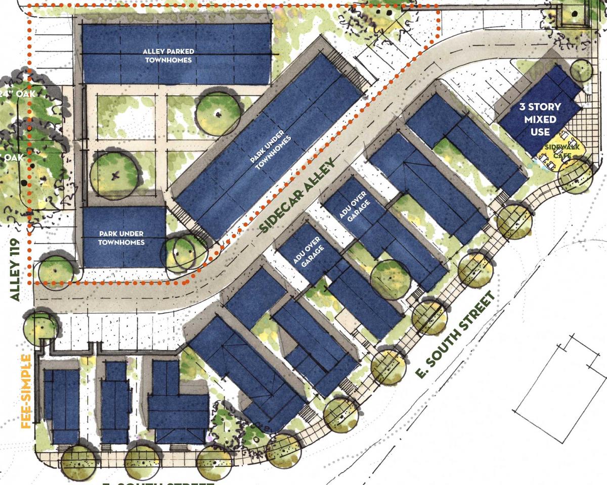 The urban-to-rural Transect is evident in the small site plan, which includes single-family detached housing, accessory dwelling units, townhouses, and a future mixed-use building on the corner. The parking is handled creatively—much of it is grouped along two alleys that pass through and border the site. The neighborhood already has mixed-use, including a brewery and pub a block away.