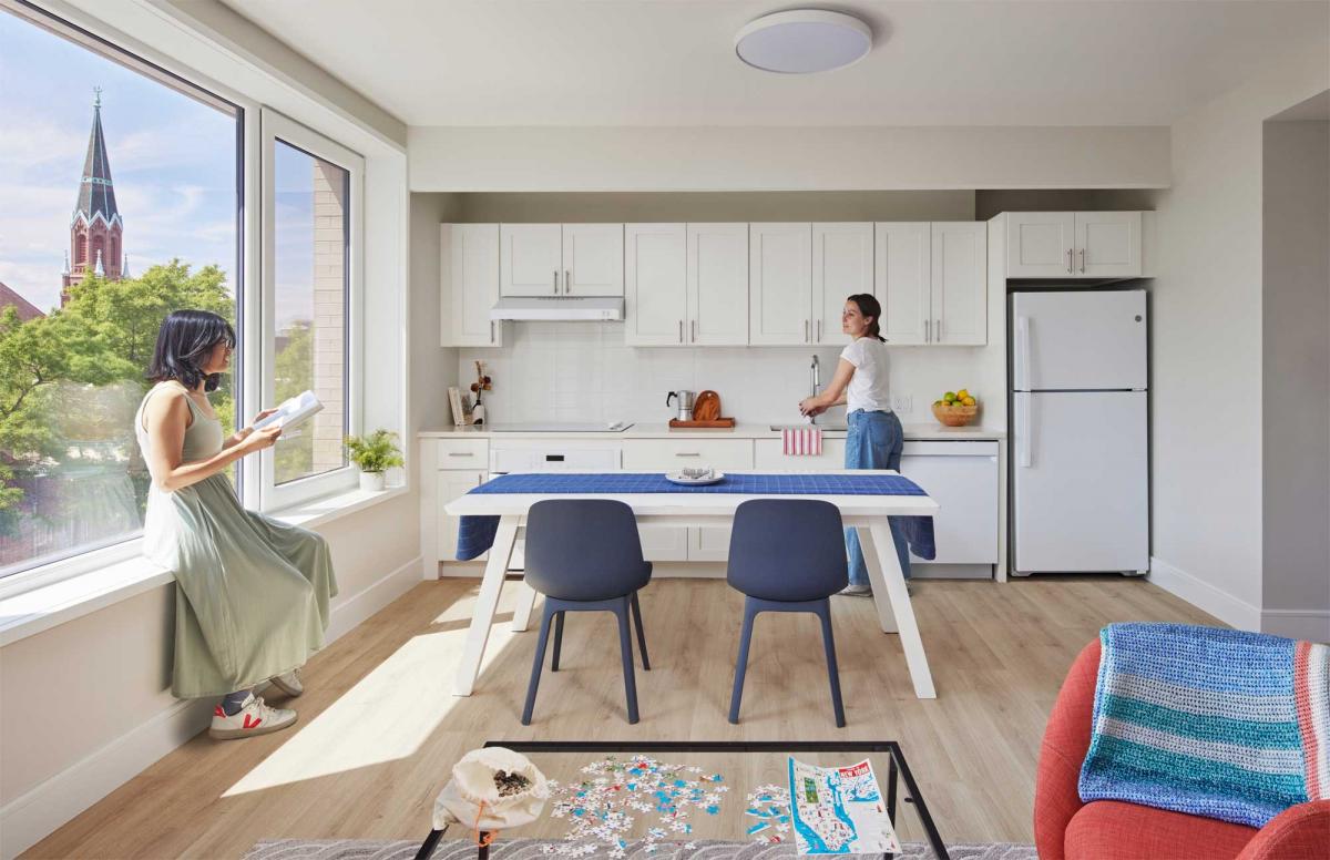 Two of the buildings have single-stair construction, which is rare in the US but allowed in a few jurisdictions, including New York City. A nationwide movement to reform codes to allow this construction, common in Europe, is underway. “The building code outlines two different exceptions—one for four story and one for five story buildings,” explain the designers. “Both exceptions were applied to this project and provided significant construction savings.”
