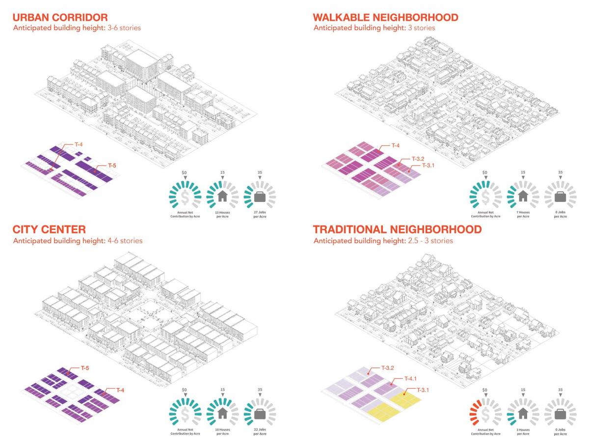 That makes development more predictable. Context-sensitive, form-based standards govern building placement, scale, and frontage in both higher- and lower-intensity areas. These standards apply consistently across projects, supporting small and large projects without project-specific negotiation.