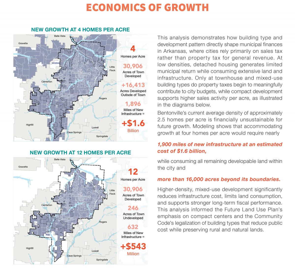 Bentonville elevates New Urbanism as a financially responsible development practice, the team reports. Compact, mixed-use places are not only encouraged but also incentivized because they perform better for residents and the public balance sheet.
