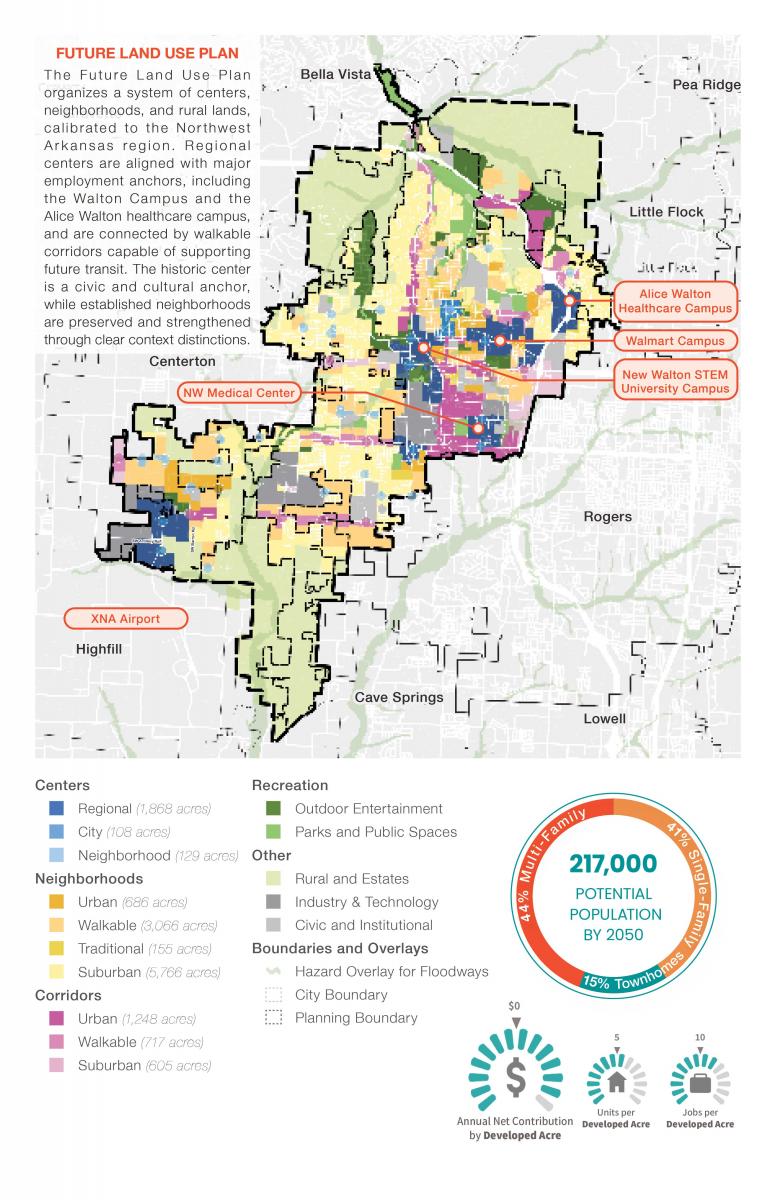 For a city with a nascent public transit system, Plan Bentonville lays the foundation for transit-supported growth. Rather than planning transit routes in isolation, the plan places neighborhood and urban centers along corridors that are likely to be major transit routes as the region grows.