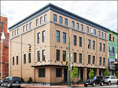 The Merchant Point Townhomes at Aliceanna and Ann Streets in Fell's Point are an example of good lowrise (rowhouse) infill. Built atop the site of the historic St. Stanislaus Kostka complex, the rowhouses offer attractive steps, overhangs, discrete windows, and other friendly, human-scale details to the sidewalk, just like traditional rowhouses. The garages were placed in the back (accessed by an alley) to avoid sacrificing the Aliceanna Street facades to blank garage doors.