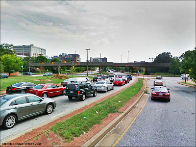 Although this strategy is quite useful in encouraging pedestrians to cross arterials that already have adjacent pedestrian activity, like Pratt Street, it can't induce pedestrian life in and of itself, particularly if there's nothing worth crossing for/walking to! For example, improved signal timing would do little to reduce the vacuum side effect of MLK Boulevard. To create something worth walking to, you'd have to build the mixed-use infill we discussed in the previous post!